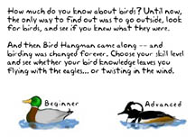 | Bird Hangman - Shockwave Another in the Hangman of the Month series, Bird Hangman tests your knowledge of North American bird names both common and obscure. Unless you're a serious birder, don't even try the advanced level of the game. Seriously. You will lose. Oh, you take that as a challenge? Well, go ahead, then! This can only end in tears! Play now! |